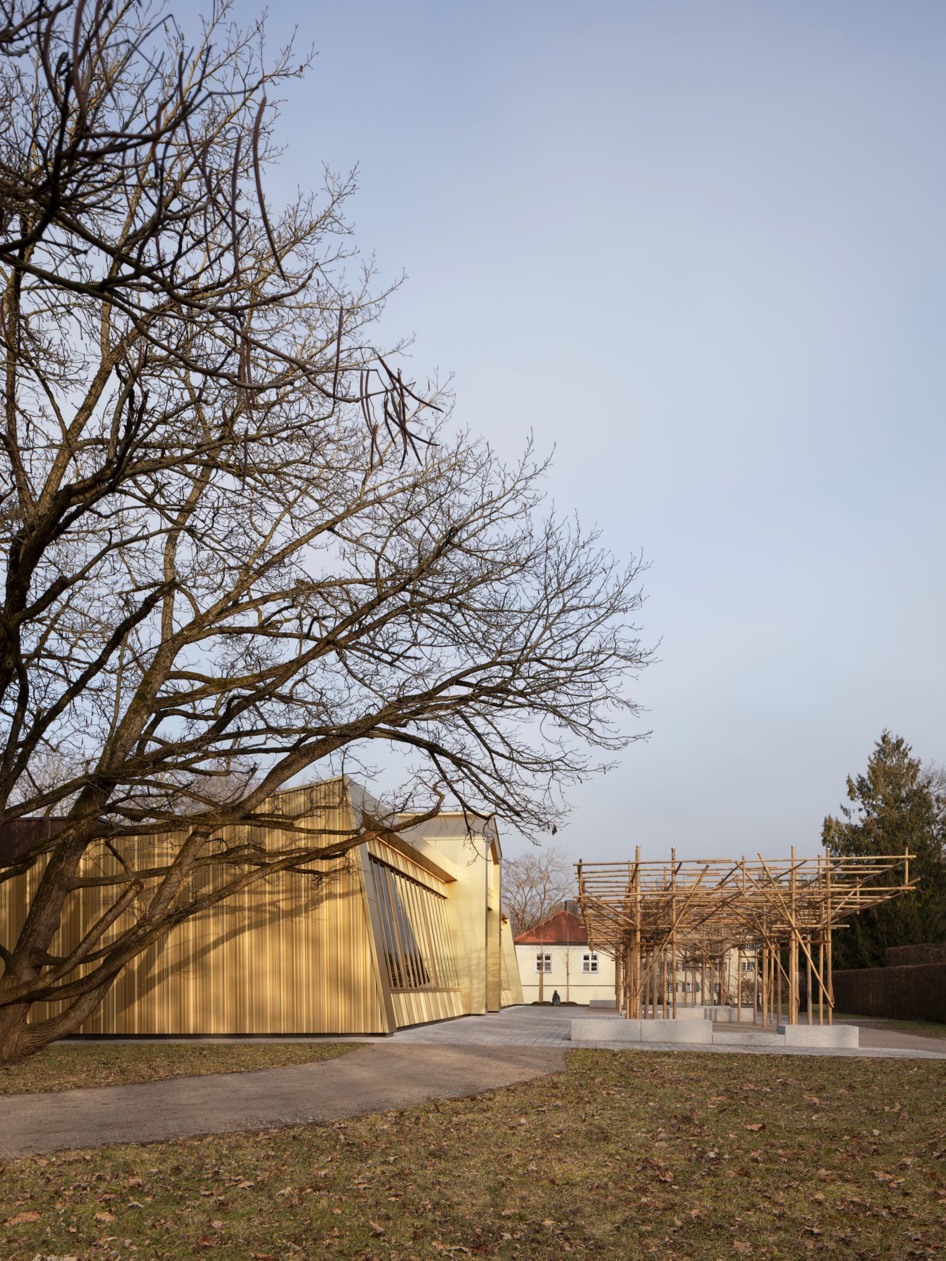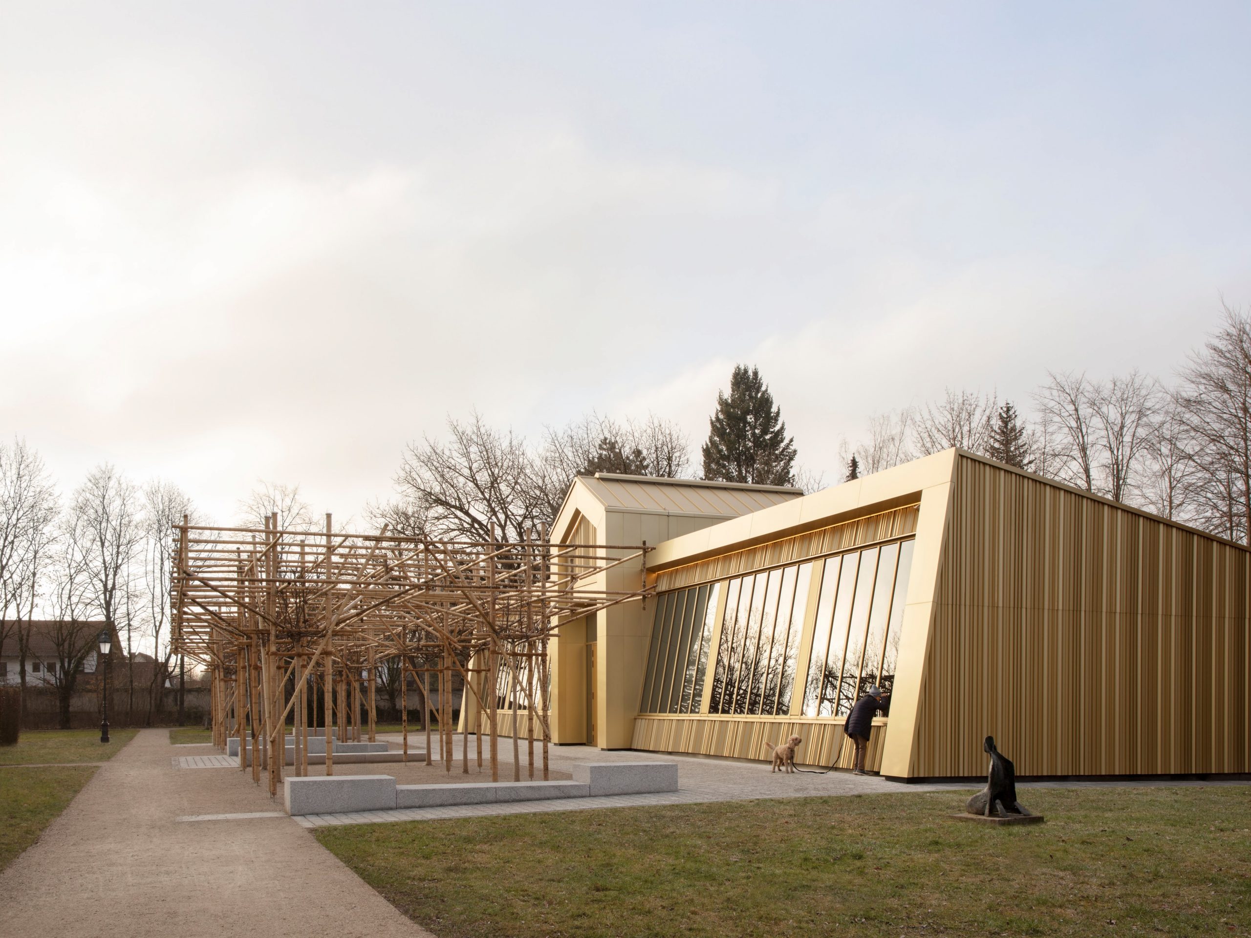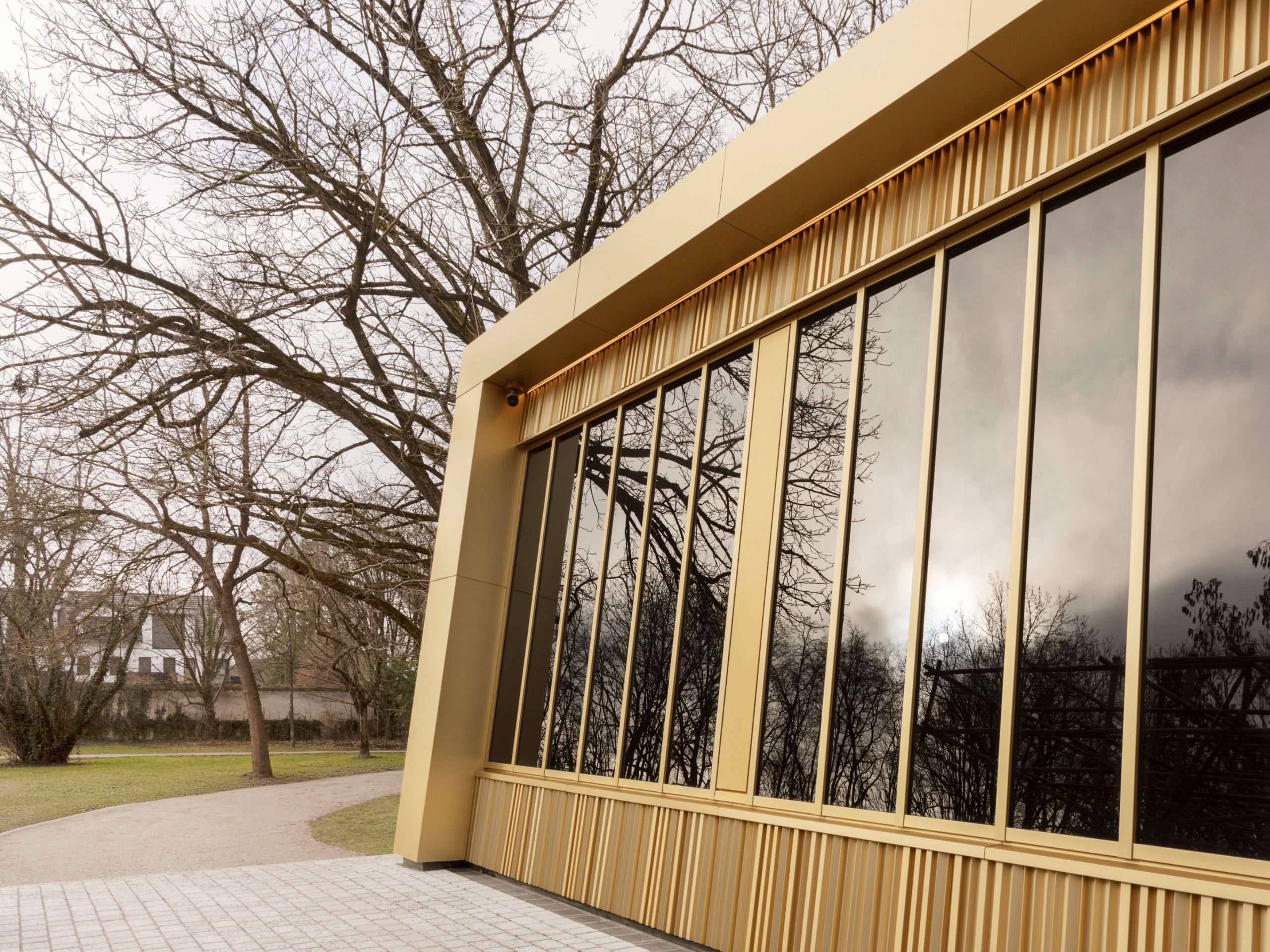 Nähert man sich dem Museum vom Park aus, präsentiert es sich in einem neuen Gewand. Statt der alten Holzfassade, die witterungsanfällig und wartungsintensiv war, zeigt sich das Haus nun mit einer Fassade aus eloxiertem Aluminium, deren Farbton vom Gelb der Nachbargebäude im Ismaninger Schlosspark, wie Schlossmuseum und Schlosspavillon, abgeleitet wurde. Große Flächen der neuen Fassade wurden gefaltet ausgeführt, so dass sie aufgelockert erscheinen und ein lebendiges Farbspiel entfalten. Die vertikale Faltung, die sich auch an die Rindenstrukturen der umgebenden Bäume anlehnt, wurde eigens für das Museum entwickelt und stellt in stilisierter Form den Schriftzug „Kallmann-Museum“ dar.