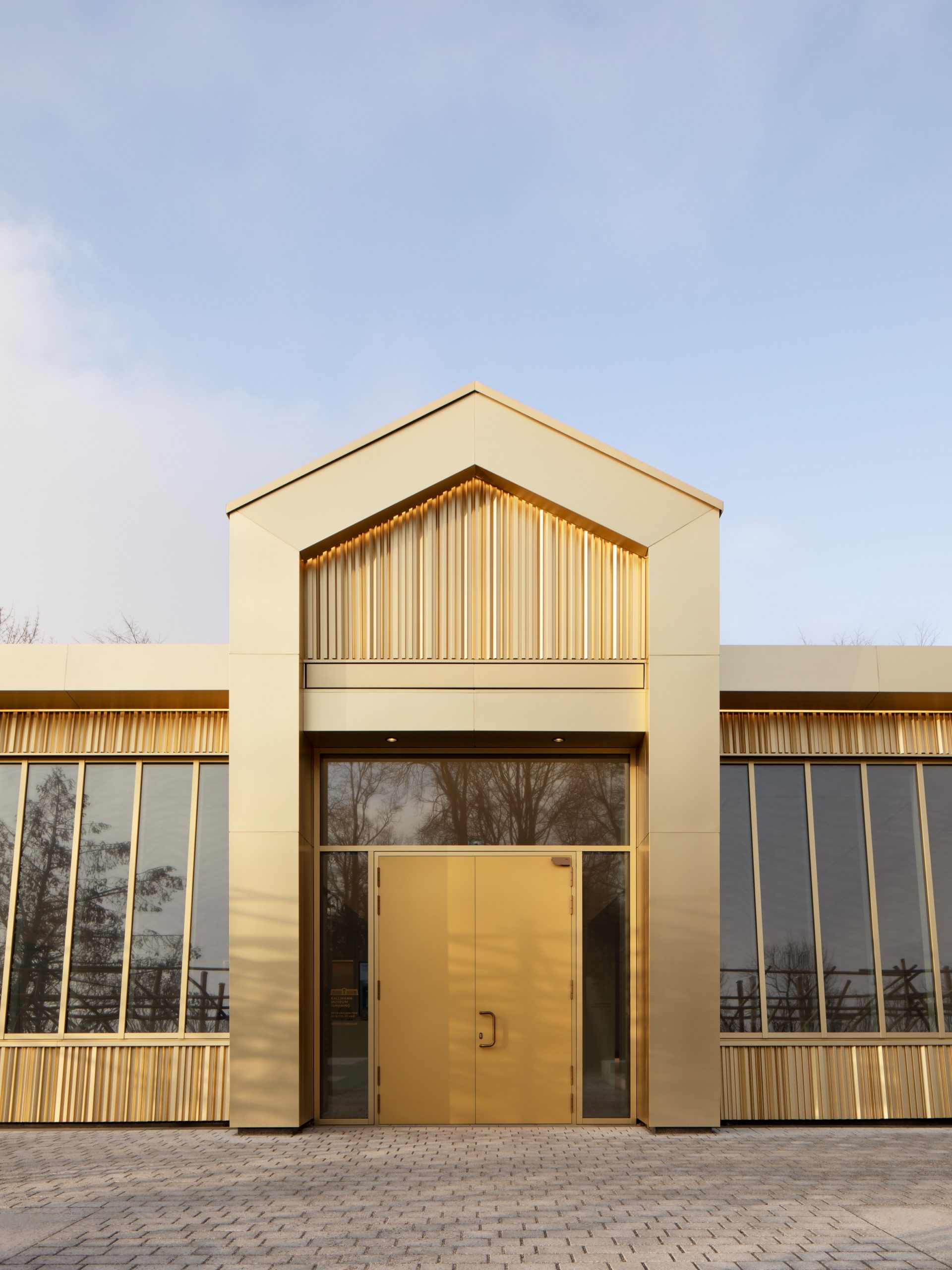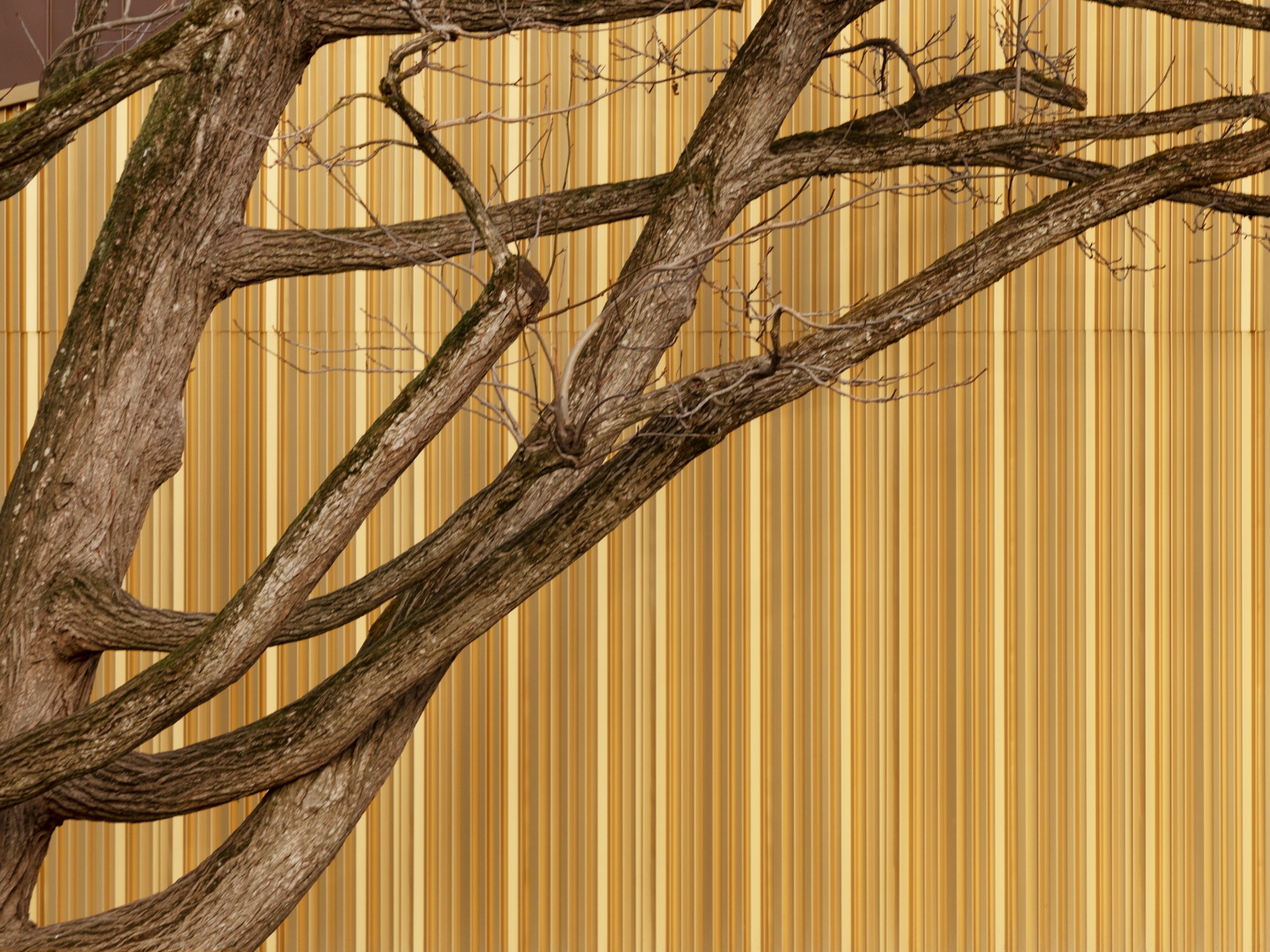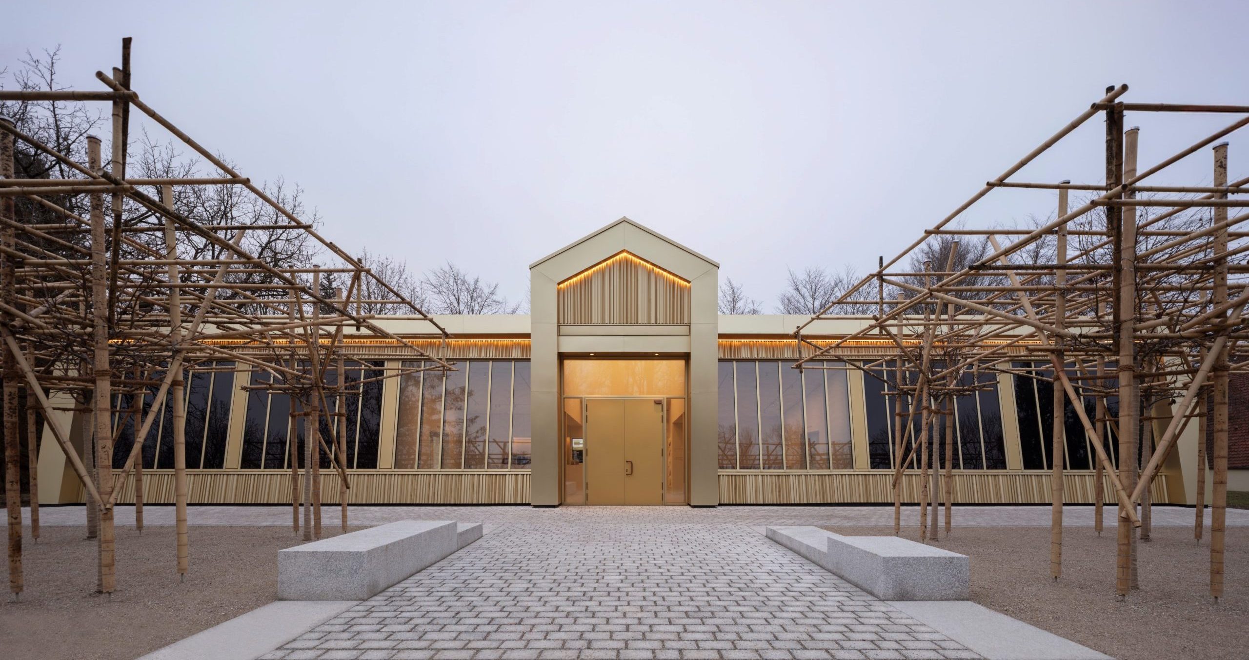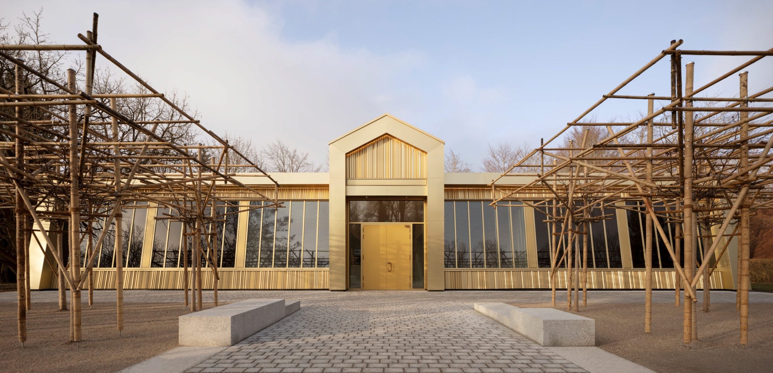 Nähert man sich dem Museum vom Park aus, präsentiert es sich in einem neuen Gewand. Statt der alten Holzfassade, die witterungsanfällig und wartungsintensiv war, zeigt sich das Haus nun mit einer Fassade aus eloxiertem Aluminium, deren Farbton vom Gelb der Nachbargebäude im Ismaninger Schlosspark, wie Schlossmuseum und Schlosspavillon, abgeleitet wurde. Große Flächen der neuen Fassade wurden gefaltet ausgeführt, so dass sie aufgelockert erscheinen und ein lebendiges Farbspiel entfalten. Die vertikale Faltung, die sich auch an die Rindenstrukturen der umgebenden Bäume anlehnt, wurde eigens für das Museum entwickelt und stellt in stilisierter Form den Schriftzug „Kallmann-Museum“ dar.