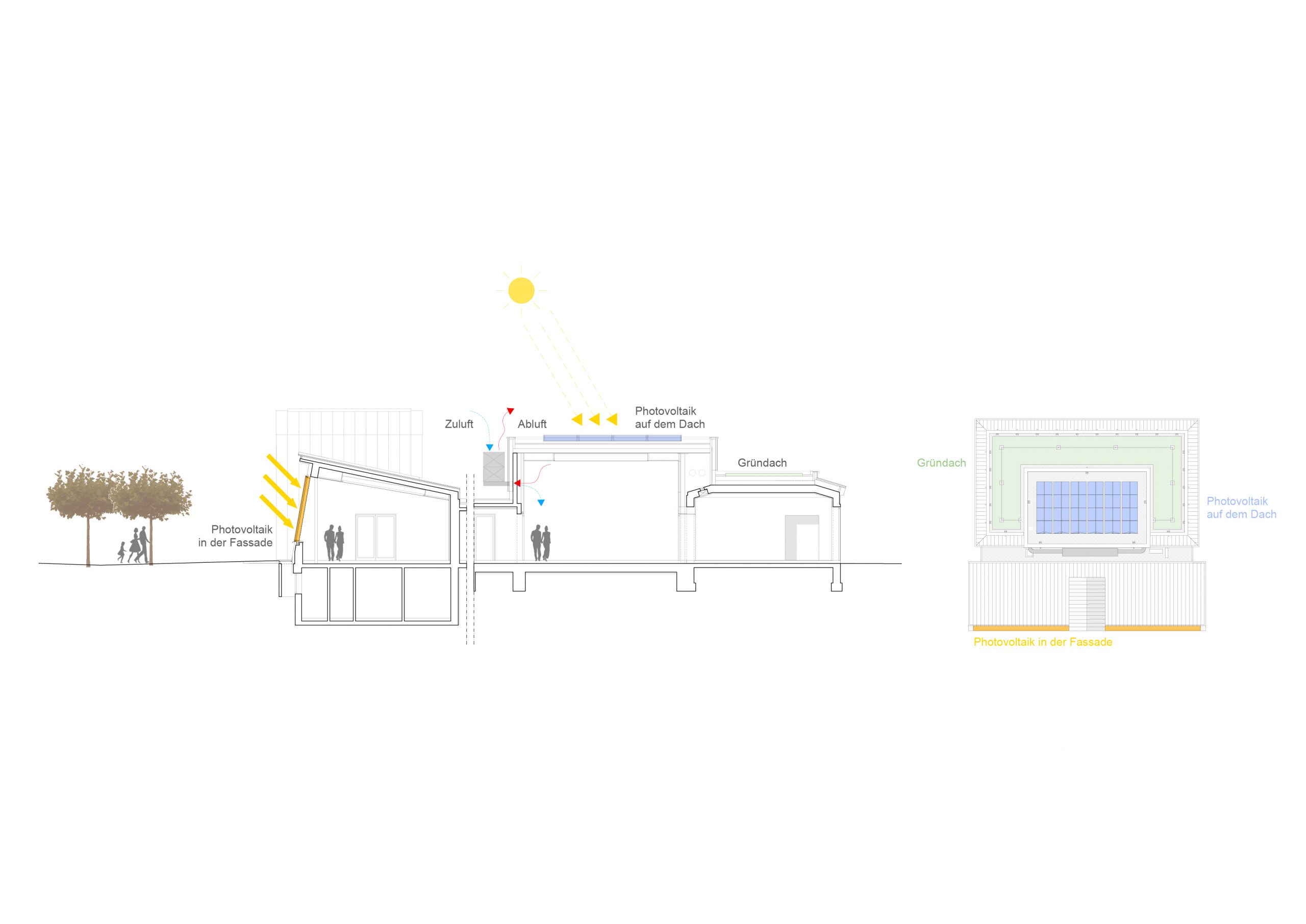 Als Lösung werden die jeweils zwei äußersten Fenstermodule durch Photovoltaikanlagen ersetzt. In den Ausstellungsräumen wird kein Tageslicht benötigt und somit wird die Nutzung der Sonnenenergie neu interpretiert. Die raumklimatischen Problemzonen können erheblich reduziert werden.