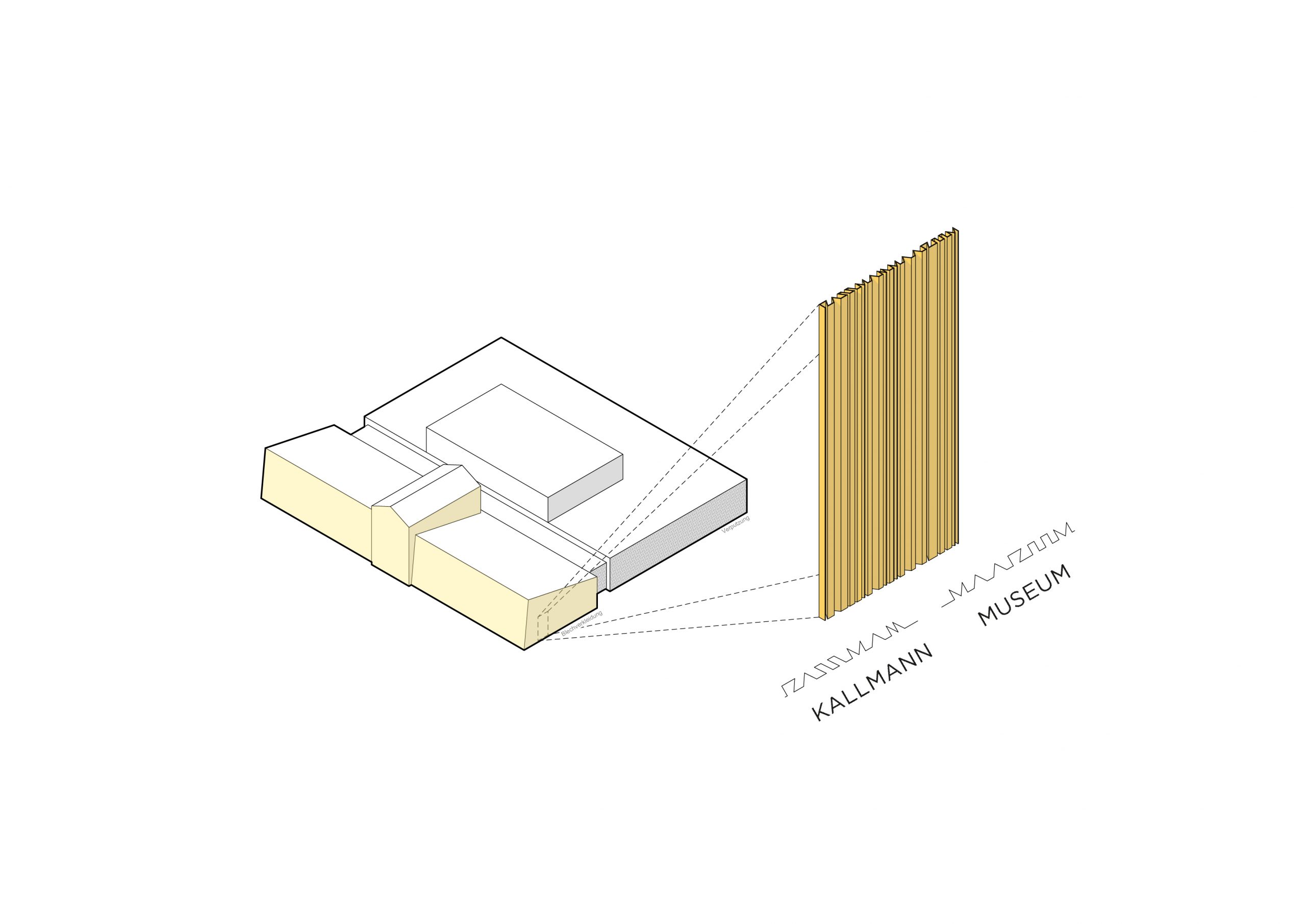 Nähert man sich dem Museum vom Park aus, präsentiert es sich in einem neuen Gewand. Statt der alten Holzfassade, die witterungsanfällig und wartungsintensiv war, zeigt sich das Haus nun mit einer Fassade aus eloxiertem Aluminium, deren Farbton vom Gelb der Nachbargebäude im Ismaninger Schlosspark, wie Schlossmuseum und Schlosspavillon, abgeleitet wurde. Große Flächen der neuen Fassade wurden gefaltet ausgeführt, so dass sie aufgelockert erscheinen und ein lebendiges Farbspiel entfalten. Die vertikale Faltung, die sich auch an die Rindenstrukturen der umgebenden Bäume anlehnt, wurde eigens für das Museum entwickelt und stellt in stilisierter Form den Schriftzug „Kallmann-Museum“ dar.