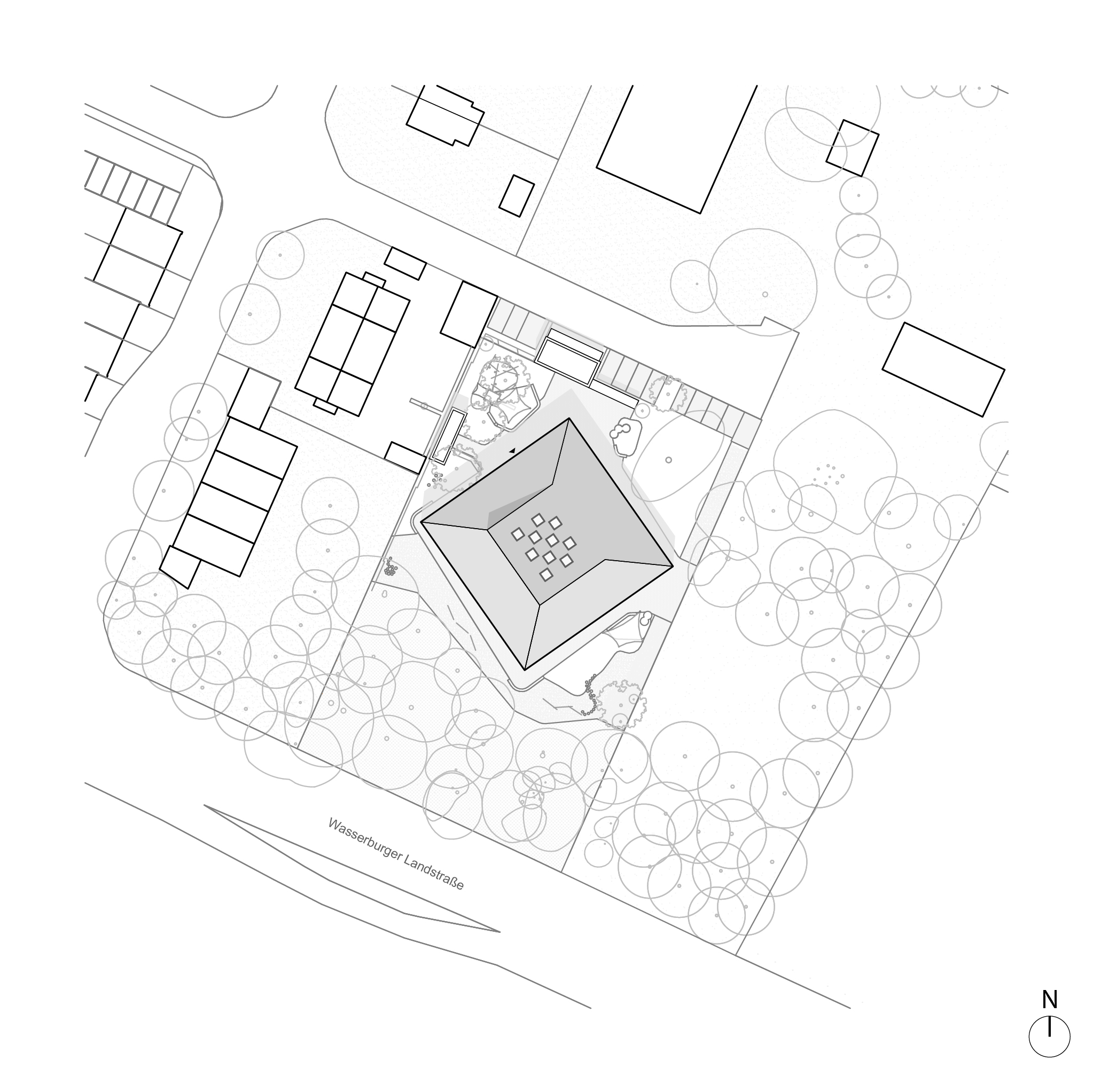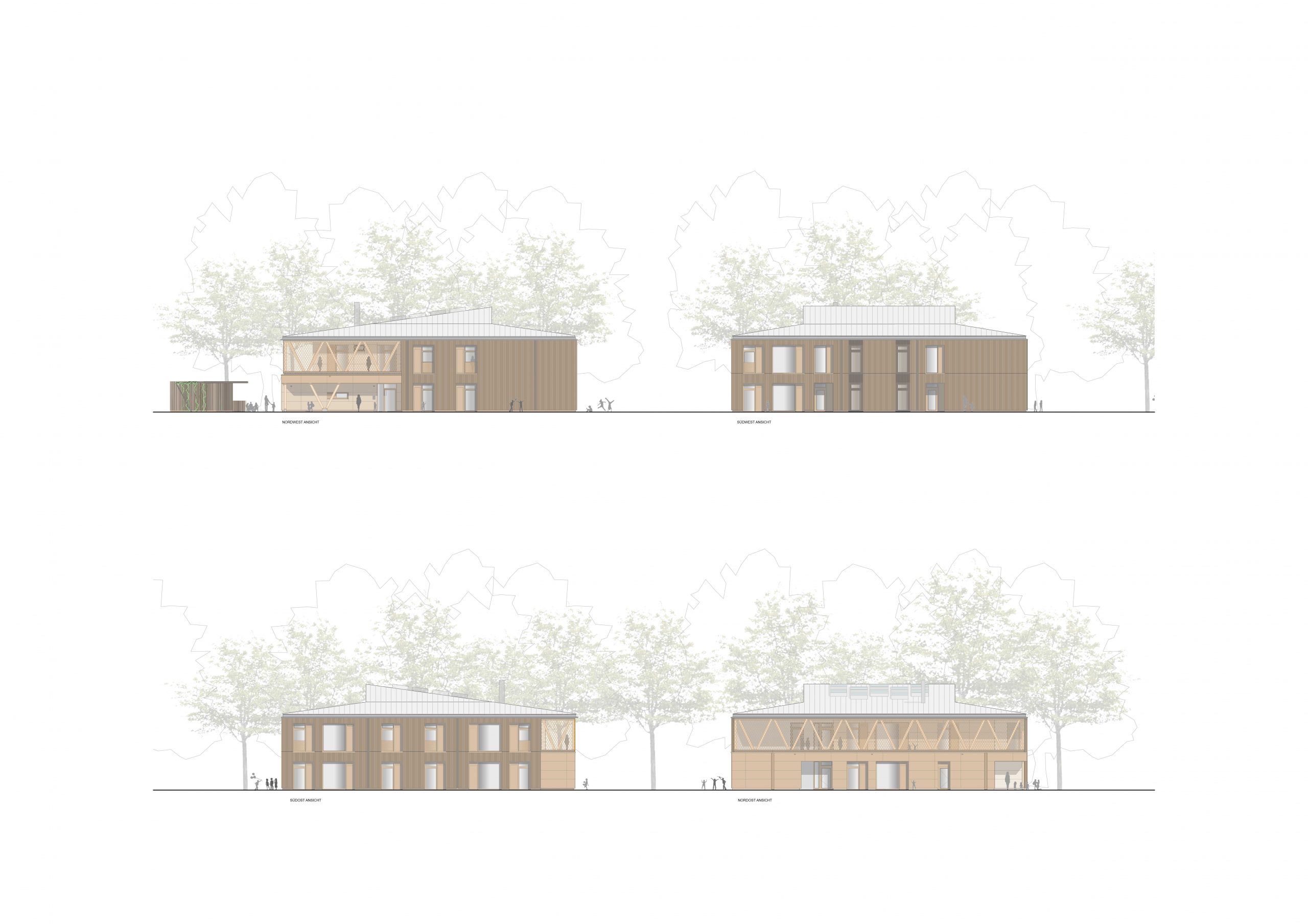 Um die Fällung von Bäumen auf ein notwendiges Maß reduzieren zu können, wurden zahlreiche Varianten in Form und Geschossigkeit unter Berücksichtigung der erforderlichen Orientierungen der jeweiligen Nutzungseinheiten untersucht. Als Favorit hinsichtlich Flächenverbrauch, Orientierung sowie Kompaktheit hat sich die Variante Quadrat herausgestellt.
