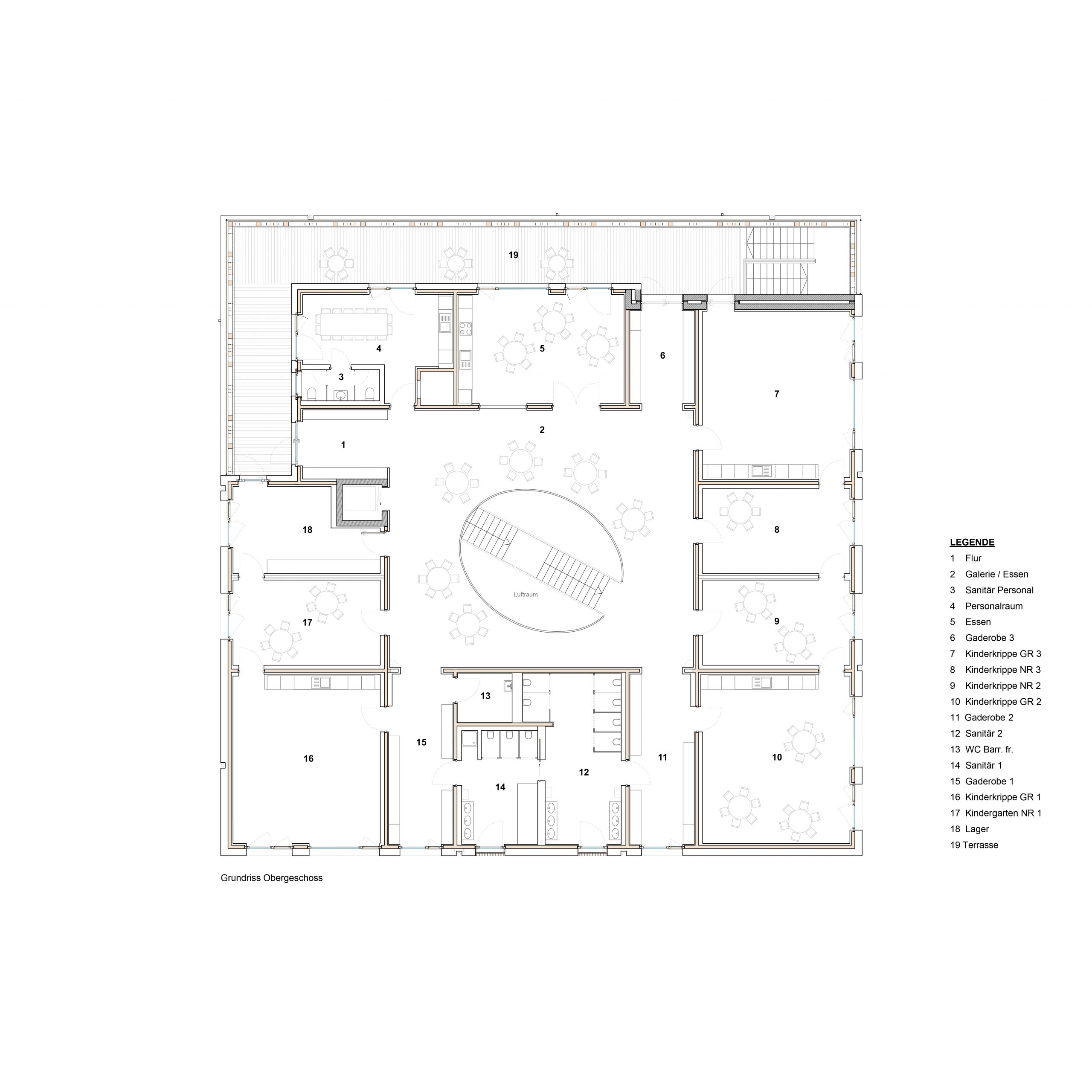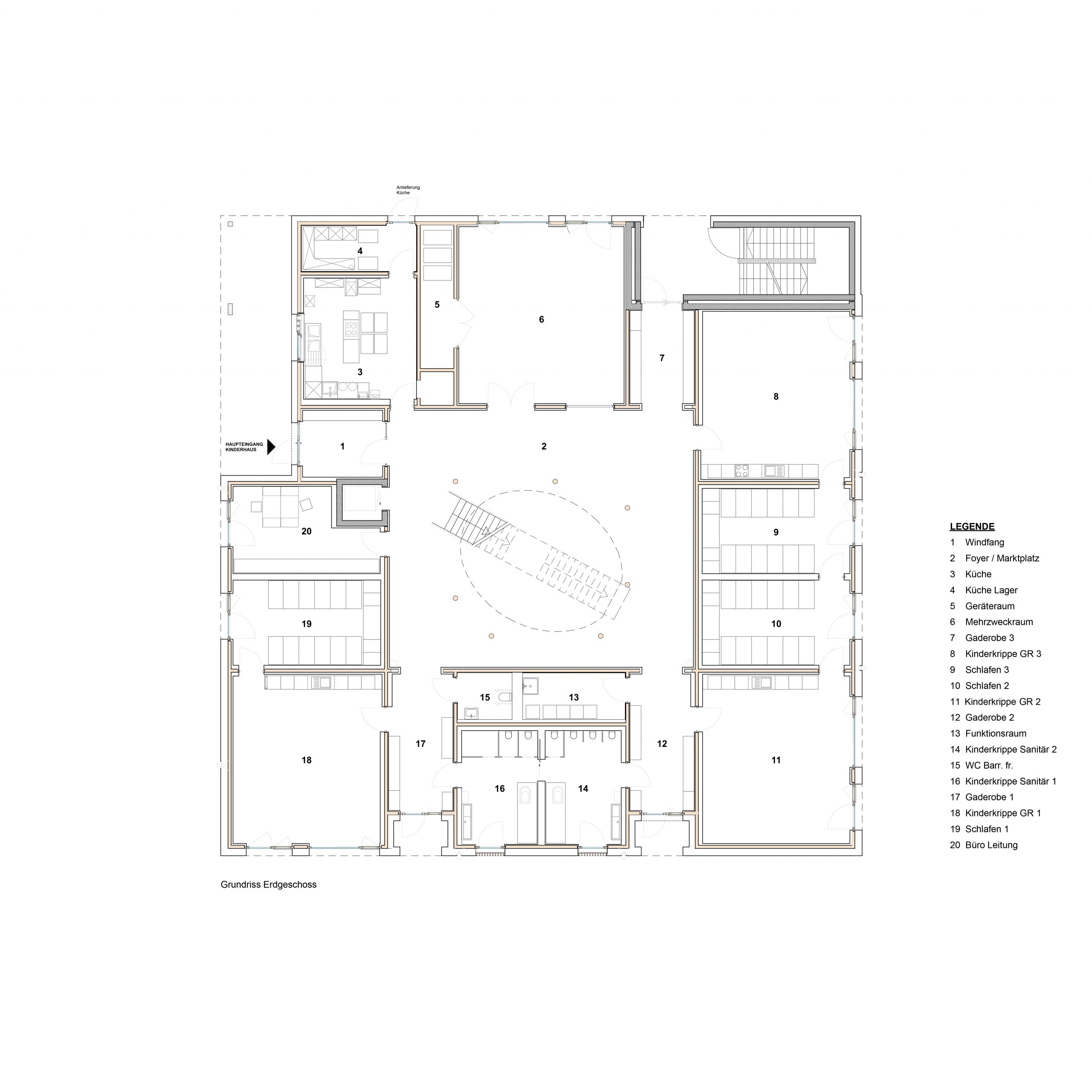 Die Gruppenräume sind auf kurzem Weg direkt vom zentralen multifunktionalen Bereich der Halle als Herz des Hauses erschlossen und im südöstlichen bzw. südwestlichen Bereich positioniert. Die WC-Bereiche sind zentral zusammengefasst.