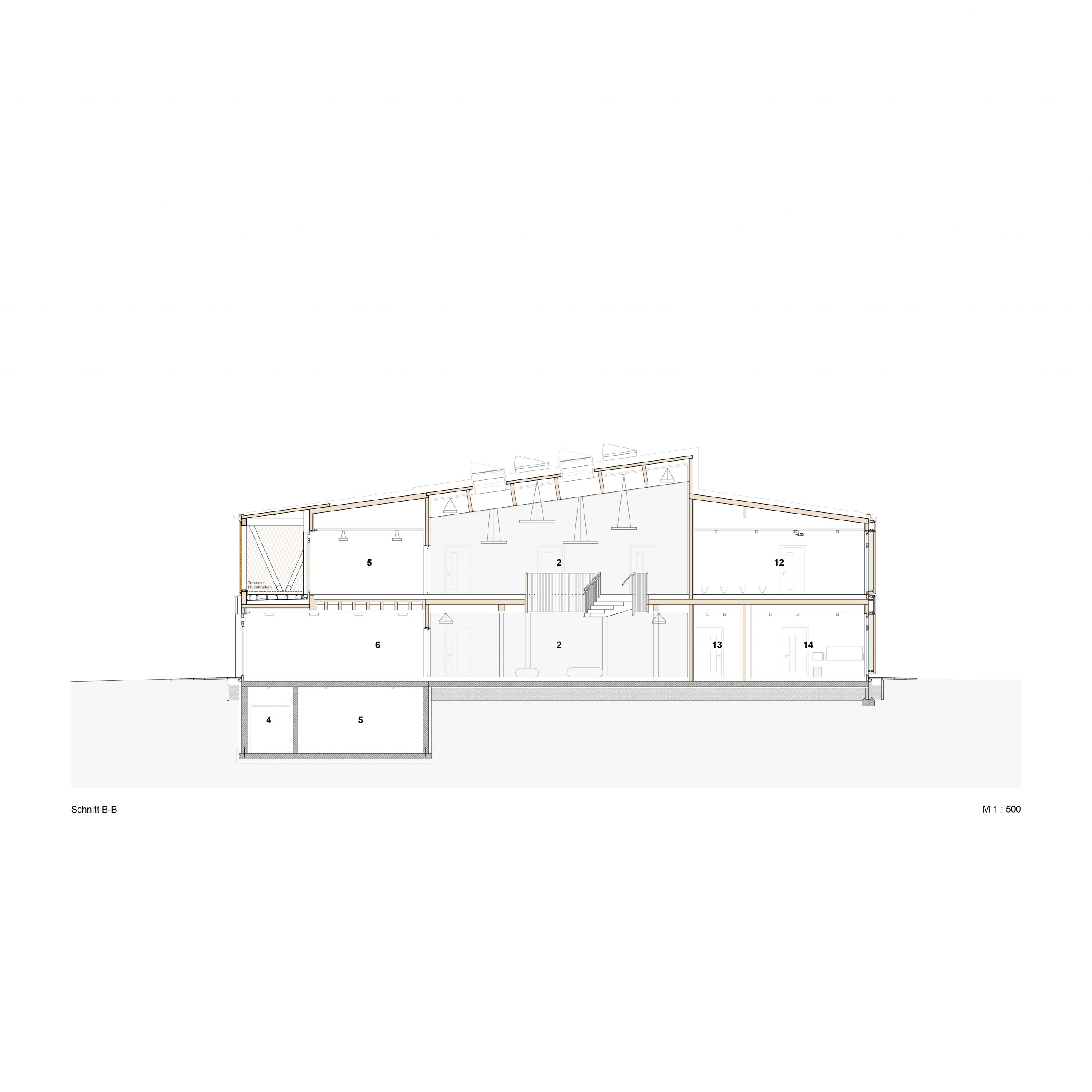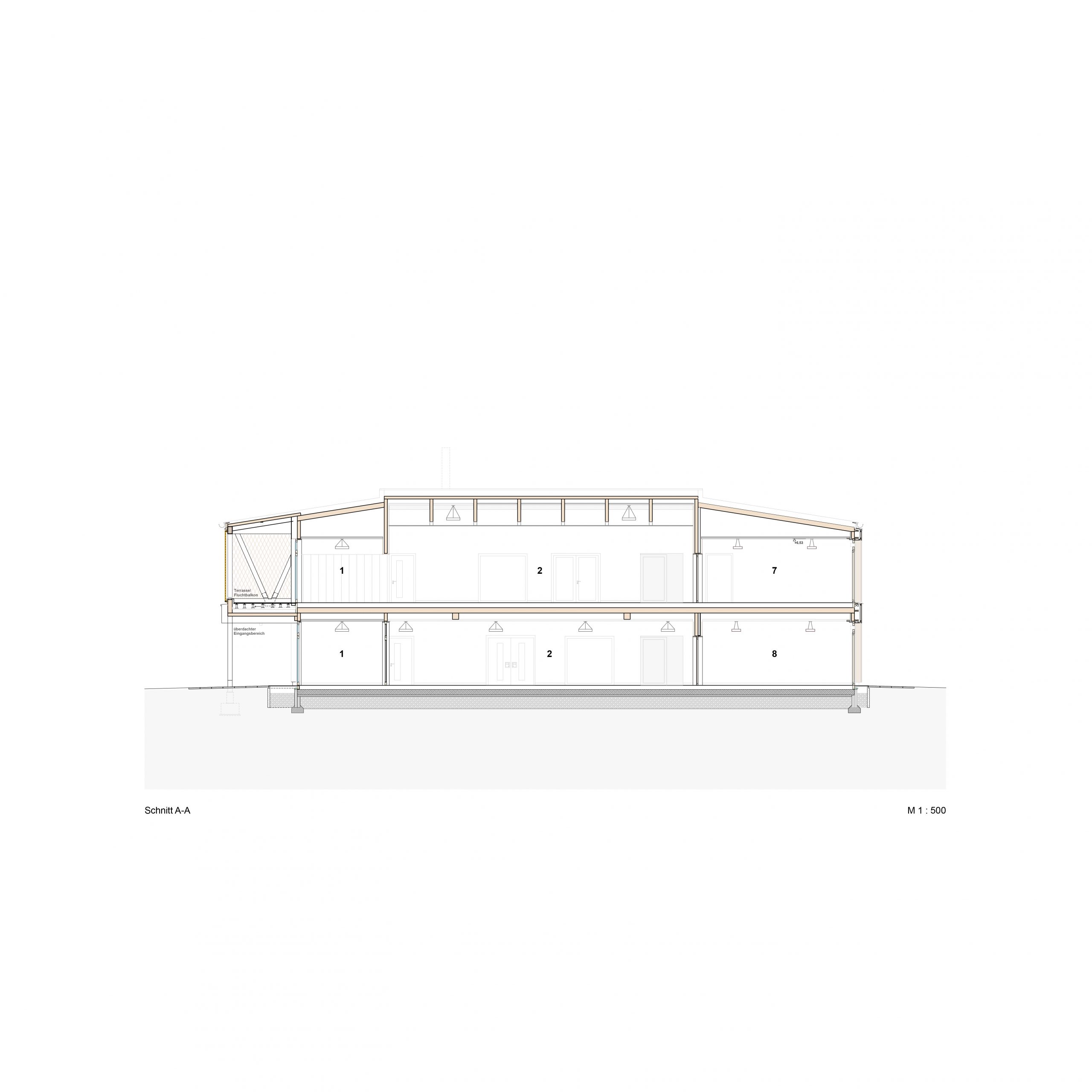 Das Dach ist als leichtgeneigtes Dach mit Blechdeckung und Dachlaterne mit integrierten Oberlichtern, für die natürliche Be- und Entlüftung geplant.