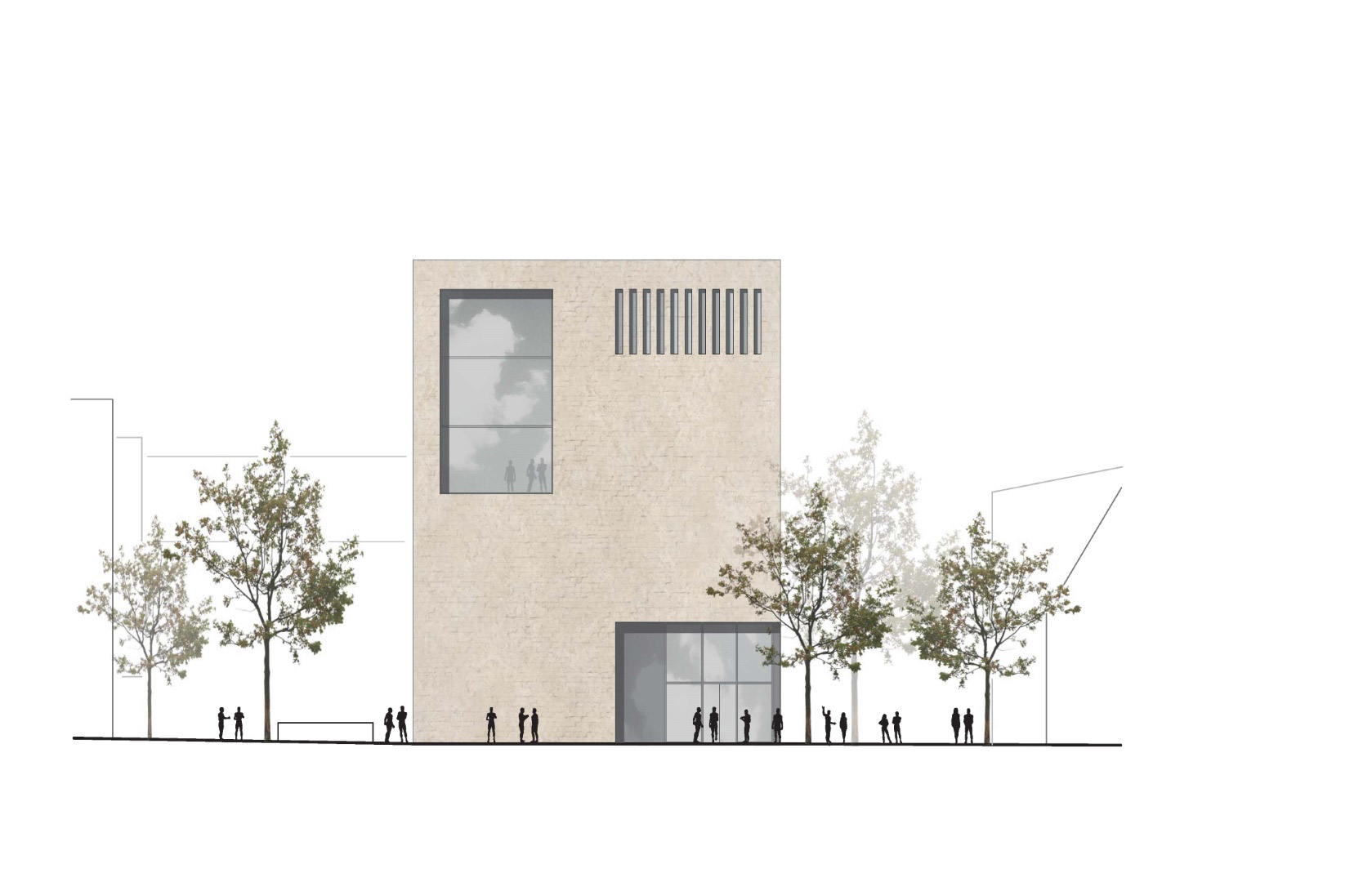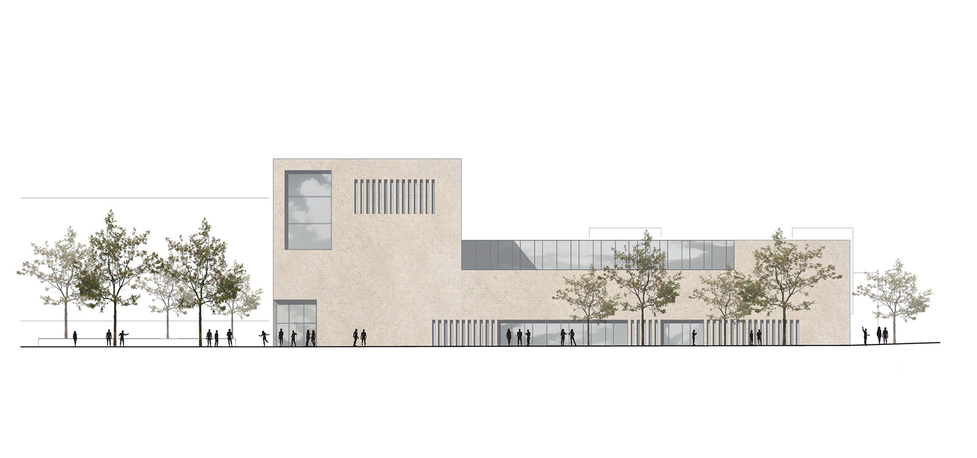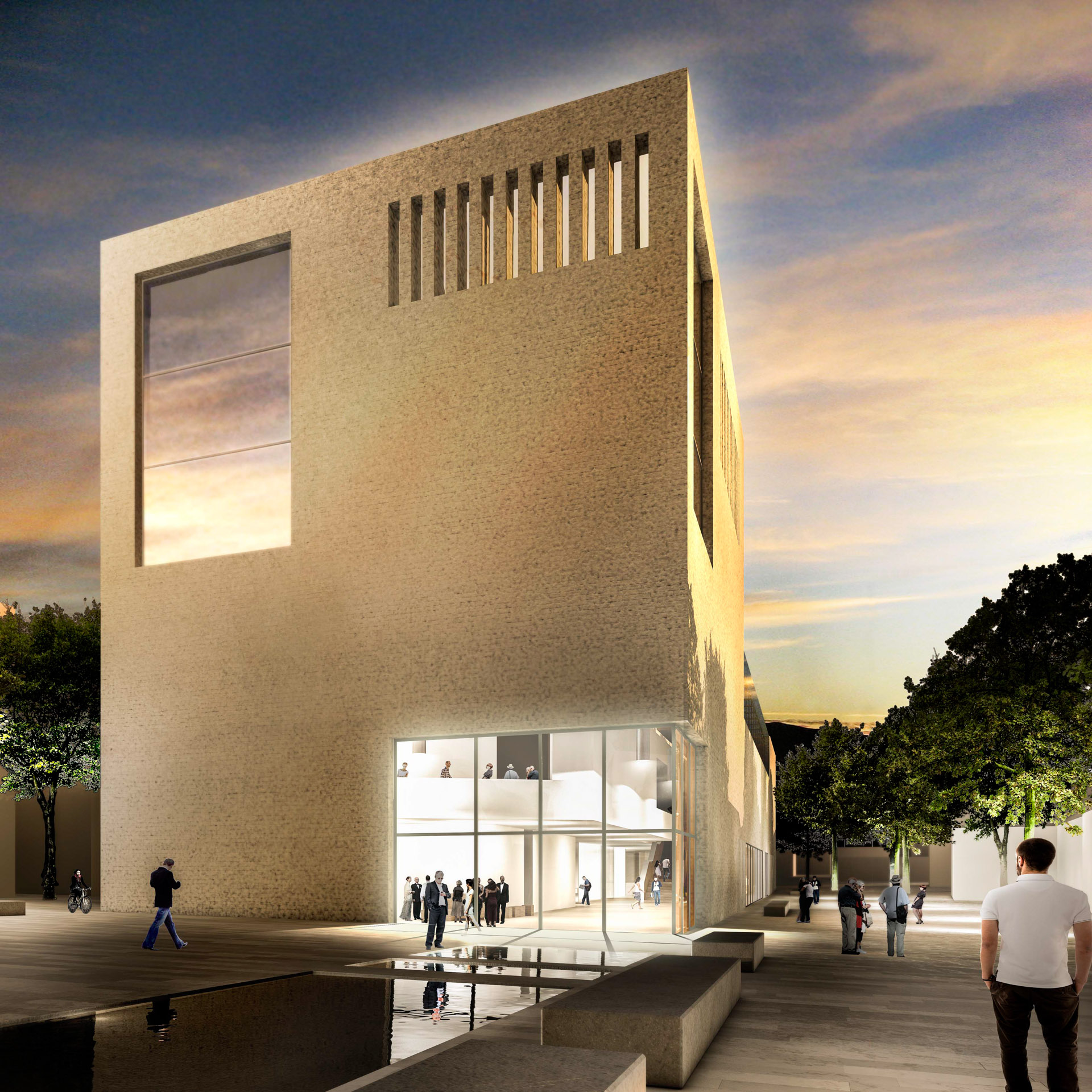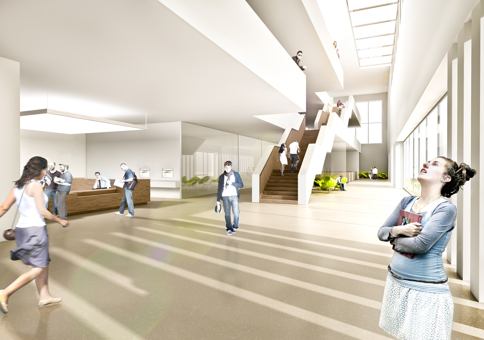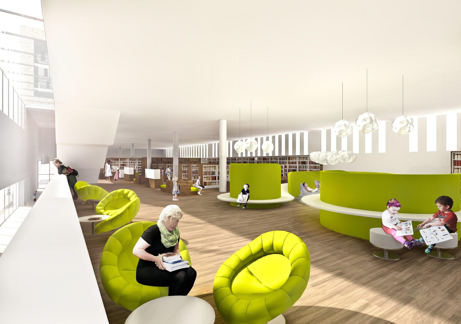 Einladend soll sie sein, die Bibliothek und auch einen freien, lichten fast schon bedeutsamen aber dennoch demokratischen Charakter haben. Es geht hier um einen Ort der Wissen und Bildung ausstrahlt. Die klare Gebäudeform mit dem klaren städtebaulichen Höhenakzent zeigt sich im Inneren als eine Hülle, die die Geschossebenen wie ein Bücherregal zeigt. Die gereihte angeordnete Treppenanlage führt in die verschiedenen Regalebenen. Der Veranstaltungssaal wirkt durch die Eingangsfassade auf den Platz. Das Materialkonzept folgt klaren geometrischer Formen, dem Prinzip der großen Hülle um einen großen Raum. Außen sandfarben geschlemmter Klinker und Glas, sonst nichts als die klare Form. Innen weiße Wände und Decken, der Boden im Erdgeschoss aus gegossenem Stein. In der Bibliothek Böden und Mobiliar aus Eichenholz. Die Bücher und Medien, dezent beleuchtet, spielen die Hauptrolle. Das Cafe an der höchsten Stelle bietet einen Blick auf die Stadt und lädt zum Verweilen ein.
