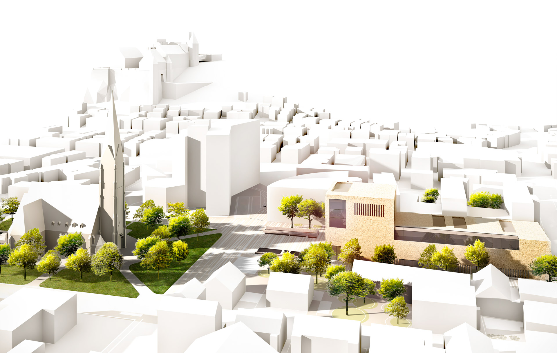 Die neue Bibliothek in Heidenheim bezieht seine räumliche Position aus dem Vis-a-Vis zur Kirche, dem kräftigen Baukörper der Stadtverwaltung und eröffnet mit einem dritten Hochpunkt an der Schnittstelle der drei Gebäude einen öffentlicher Raum mit hoher Aufenthaltsqualität. Der markante Hochpunkt mit seiner präsenten Eingangssituation setzt Bücher, Medien und damit Wissen im Allgemeinen in einen spannenden stadträumlichen und inhaltlichen Kontext.